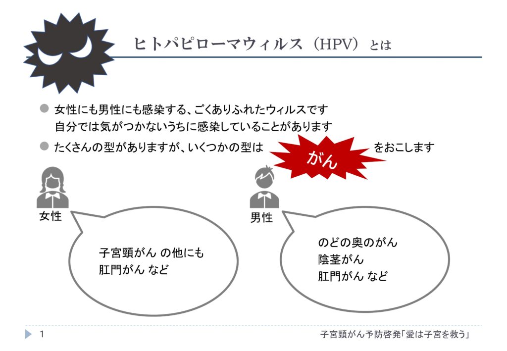 ヒトパピローマウィルス(略してHPV)は女性にも男性にも感染するありふれたウィルスで、たくさんの型があります。そのうちいくつかの型は性交渉によって男性から女性へ、あるいは女性から男性へ感染し、その後、女性の子宮頸がん、男性に多い中咽頭がん(のどの奥のがん)、肛門がんや陰茎がんなどをおこすことがあります。