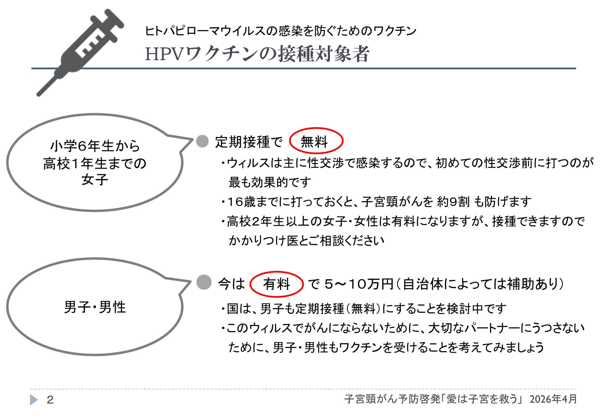 ワクチンを受けていただきたいのは、以下の方々です。まず小学6年生から高校1年生までの女子(定期接種で無料)です。男子は今のところ有料ですが、国は男子も定期接種にするかどうかを検討中です。また、定期接種年齢を過ぎた高校2年生以上の女子・女性は有料になりますが、HPVワクチンの有効性が認められていますので、ご希望があれば接種できます。かかりつけ医とご相談ください。